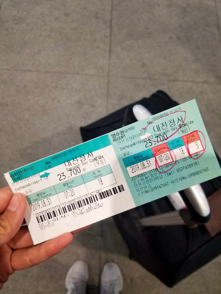 After landing in Incheon Airport, I had to purchase to a bus ticket to take to Daejeon which would take about 3 hours to get me there. Thanks to a friend I made on the plane, he helped me purchase the ticket and I was off to Daejeon!